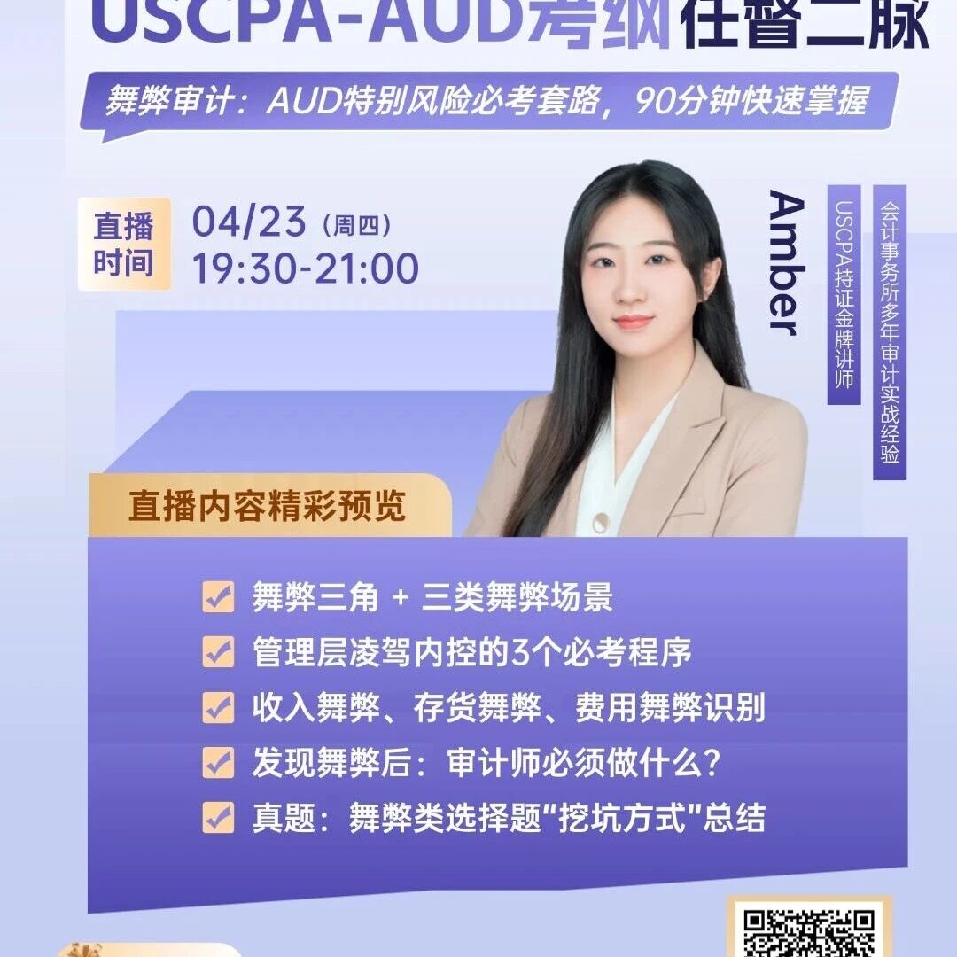 在备考USCPA美国会计师四科中,AUD一直是很多考生的卡分重灾区\n尤其是舞弊审计部分,几乎每年都考,但很多人始终抓不住重点。\n————————\n这场直播Amber老师带领大家快速掌握\n✔ 舞