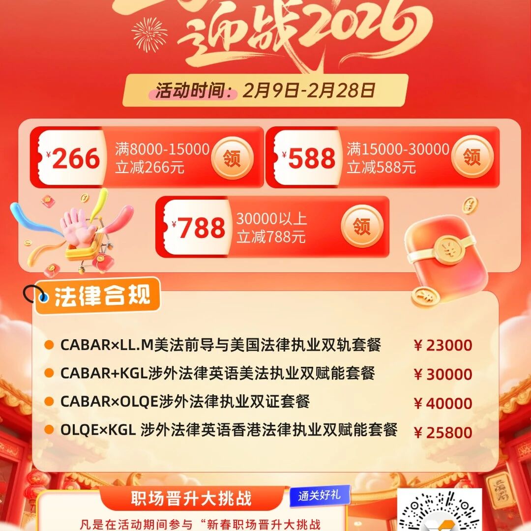 2026年货节专属机会来袭!你是不是也曾在涉外法律合规发展路上犹豫不决,不知道从哪开始?\n\n涉外法律合规证书不仅是纸面上的荣誉,它是打开海外工作机会的钥匙,是你技能升级、薪资提升、职业稳健的加速器
