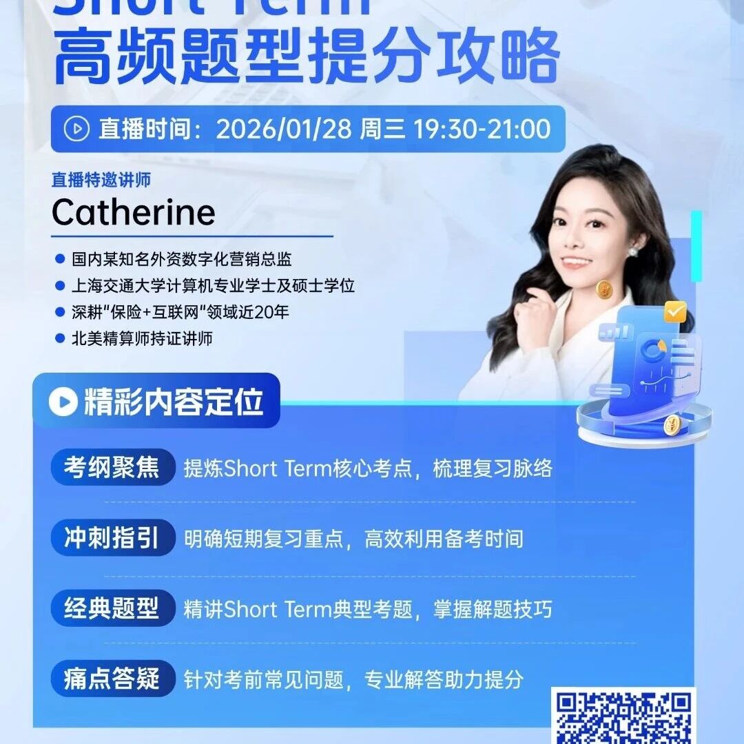 SOA Exam P冲刺公开课:这场直播,真的救命!距离SOA Exam P考试进入开考倒计时,如何高效梳理知识结构、锁定高频考点?一场权威冲刺直播,帮你突破瓶颈、稳住心态。📘持证讲师Cat