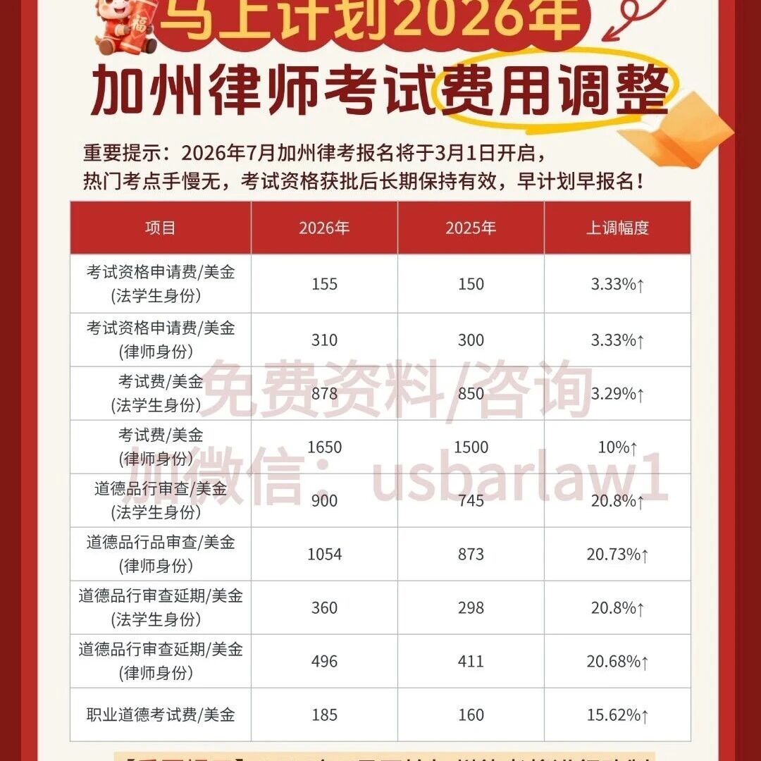 想考CABAR的小伙伴们注意啦!2026年加州律考的费用调整出来了,一起来看看怎么个事!\n\n费用涨幅有多夸张?\n道德品行审查费直接涨了20%+,法学生身份从745美金涨到900美金,律师身份从8