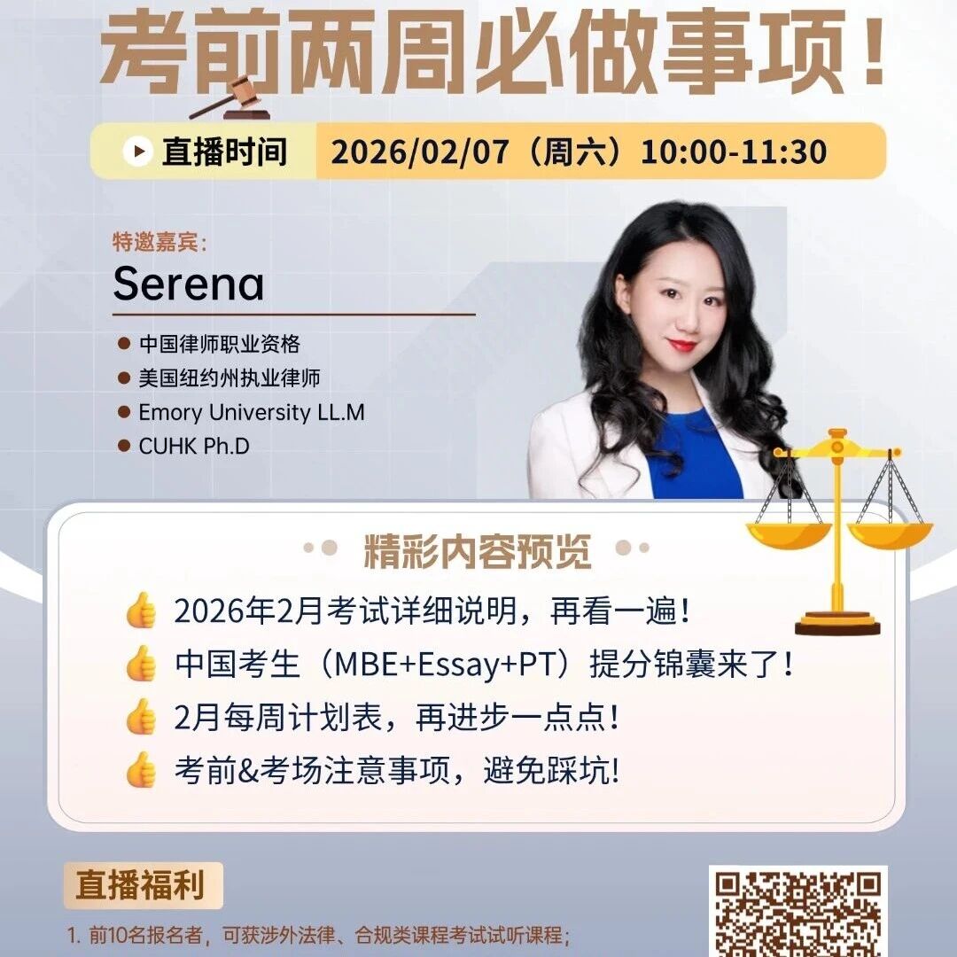 适合人群:\n1.计划备考2026年2月或7月美国律考考生;\n2.对涉外律师考试感兴趣或者有一定了解;\n3.希望扩大职业交流平台和拥有国际视野的法律人。\n#USBAR终极冲刺攻略\n\n直播精彩