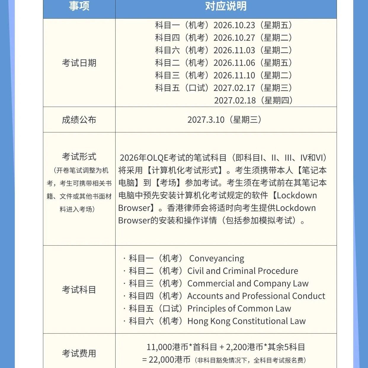 香港律师会于2026年2月5日公布了2026年香港海外律师职业资格考试OLQE考试信息。\n\n★考试信息★\n考试申请开放时间为:2026年2月5日(星期四) - 考试申请递交截止时间为: \n●