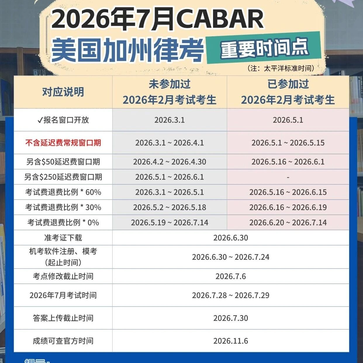 重要通知!2026年7月加州律考4月2日开始加收延迟报名费!抓紧时间报名!\n\n2028年7月改制前仅剩4次旧模式考试机会,MBE题库也将在改制后停用,现在冲刺上岸机会,别错过!\n\n考试核心时间