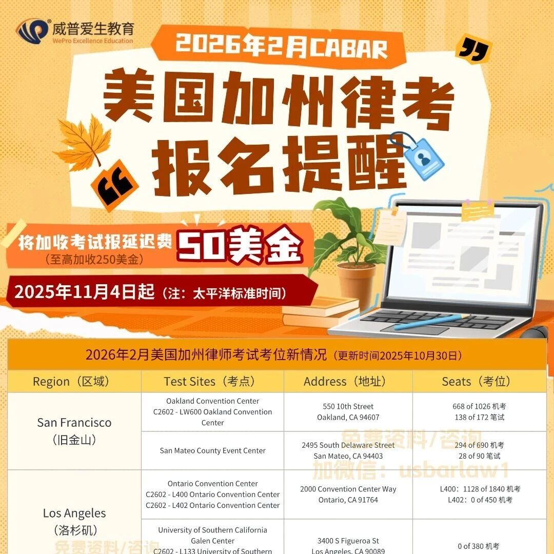 2026年2月CABAR考位告急!即将加收报考延迟费50美金!有需速报名!想考美国加州律考CABAR的看过来!2026年2月的CABAR考试考位剩余不多,还没报名的速速报名!2025年11月