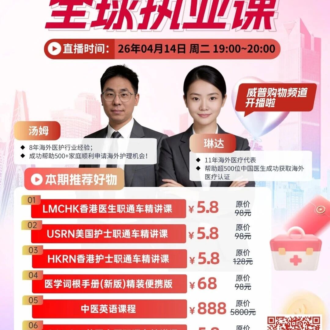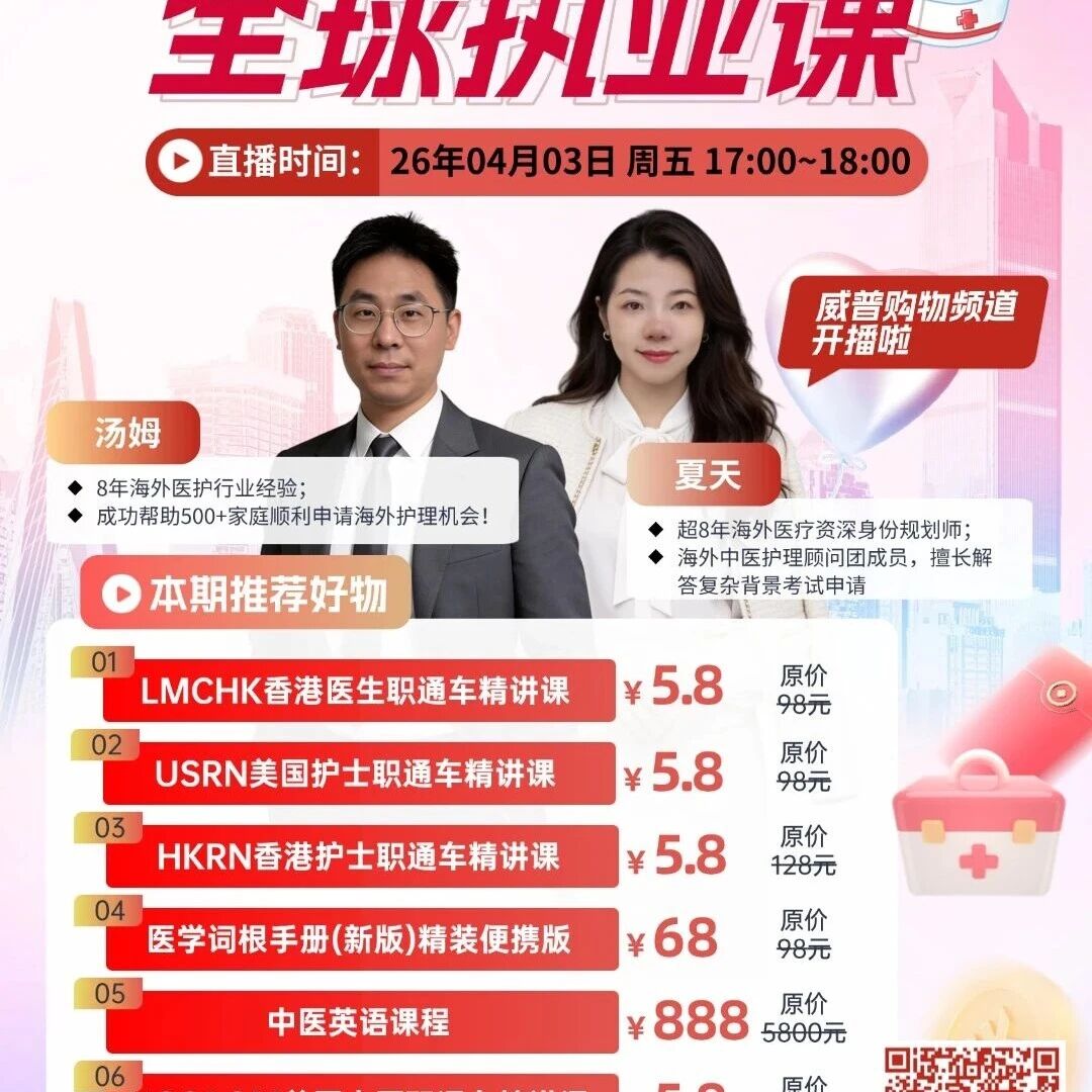 中医护理出海,这几年越来越多人在讨论。香港护士、美国护士、美国中医执业,听起来机会不少,但很多人其实并不知道:自己到底适不适合走这条路?这场直播,我们把几条常见路径拆开讲一讲。\n\n威普购物频道|2